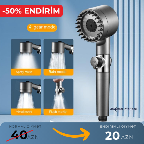 Masaj funksiyası və Yüksək Təzyiq: Bu duş başlığı baş dərisi və bədəndəki stressi aradan qaldırmağa kömək edən masaj funksiyasına malikdir. 4 fərqli sprey rejimi təklif edir. Keyfiyyətli hamam təcrübəsindən həzz alın.